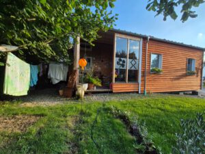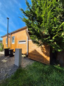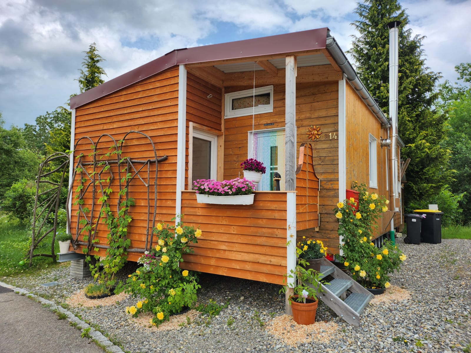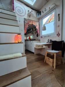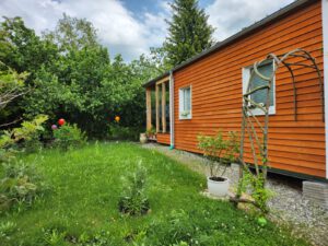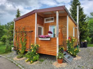 Dieses charmante Tinyhaus (Baujahr 2022) vereint durchdachte Raumplanung, warme Holz-Atmosphäre und moderne Funktionalität auf kompakten 48 m².Der offene Wohn-/Essbereich mit Küchenzeile (2-Platten-Herd & kleiner Backofen) bildet das Herz des Hauses. Die Treppe zum Schlafbereich nutzt den Raum darunter clever: Hier sind der Bosch-Kühlschrank sowie ein Apothekerschrank elegant integriert.