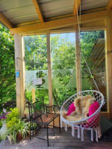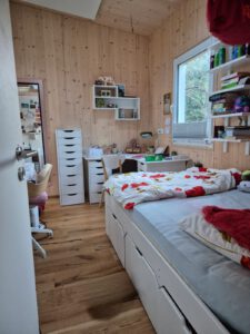 - reines Holzhaus; Deckenhöhe Mitte ca. 4,20 m; viele Fenster, 3 Dachfenster; Bad mit Fenster (Tageslichtbad)